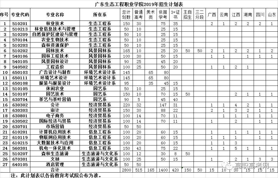广东生态工程职业学院2019年高职高考3+证书招生计划